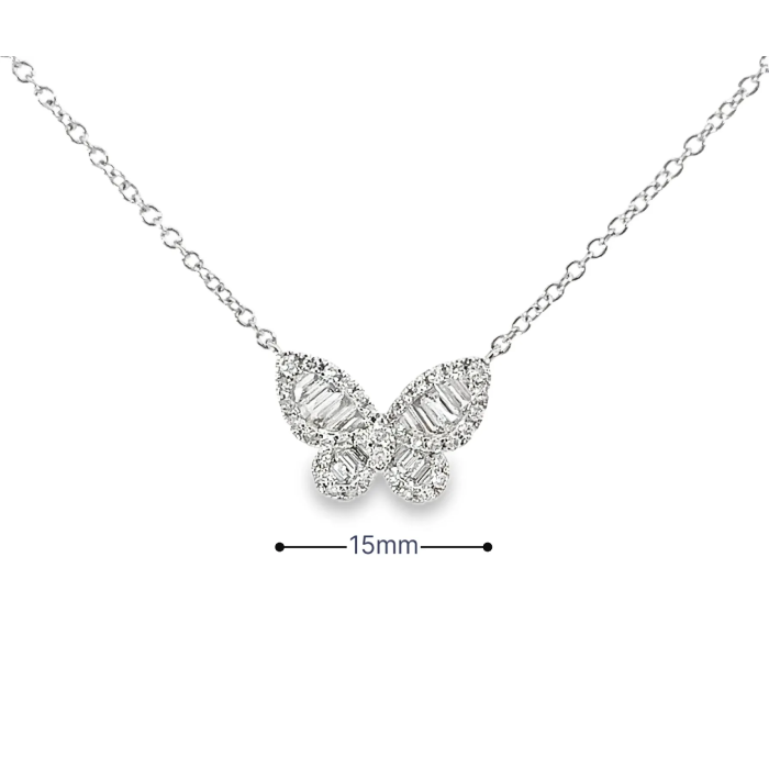 This stunning butterfly pendant is a perfect blend of elegance and charm. Crafted with intricate detailing, it features sparkling white Baguette diamonds in the center of the wings accented all around by brilliant round diamonds that catch the light beautifully. It is permanently attached to a 16 inch split cable chain.